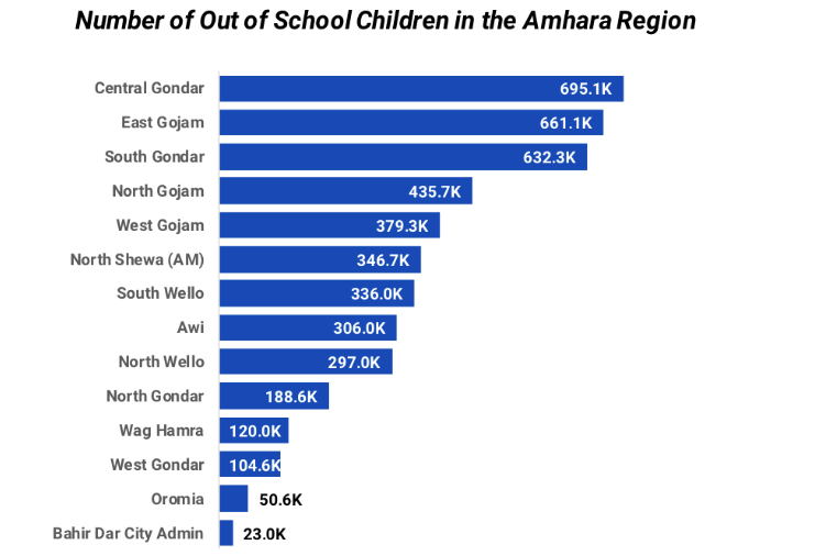 Within the Amhara Region, as data from EEC (see the graph below) show, in the Central Gonder zone alone, close to 700,000 children are out of school. The same source indicates that in North Gojam, over 90% of school-aged children have no access to formal education.