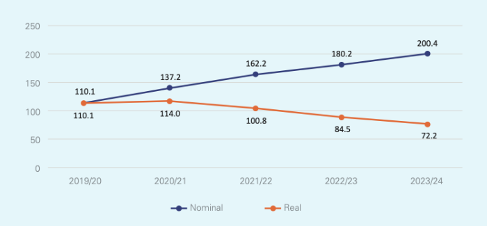 Investing in education. Education appears to be a low priority for the current government. World Bank data show that Ethiopia’s expenditure on education as a share of GDP fell from 5.5% in 2017 to 3.7% in 2022. The latest UNICEF budget brief shows that, in Ethiopia, Real educational spending has declined from 110 billion birr in 2019/20 to 72 billion birr in 2023/2024. The following graph show the nominal and real education spending (in billion Ethiopian Birr).