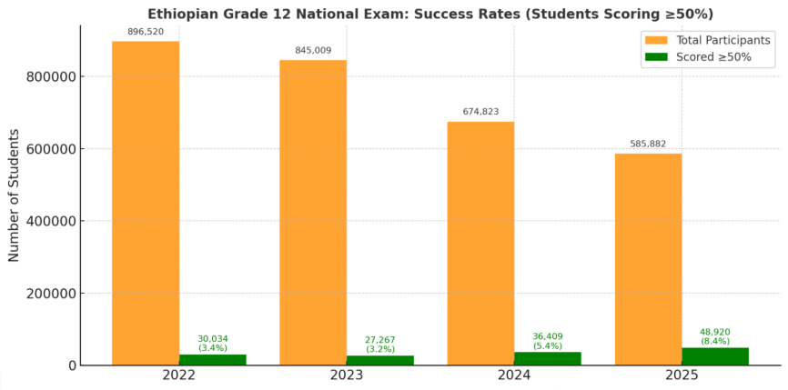 Ethiopia’s education system has faced deep-rooted challenges, with its secondary schools teetering on the edge of collapse. On 14 September 2025, Minister of Education Berhanu Nega announced that 536,962 students—over 91% of all examinees—failed to achieve the passing mark of 50% in this year’s Grade 12 examination, underscoring the severity of the crisis. Only 2,384 students scored 500 out of 600, highlighting the extreme rarity of top performance.