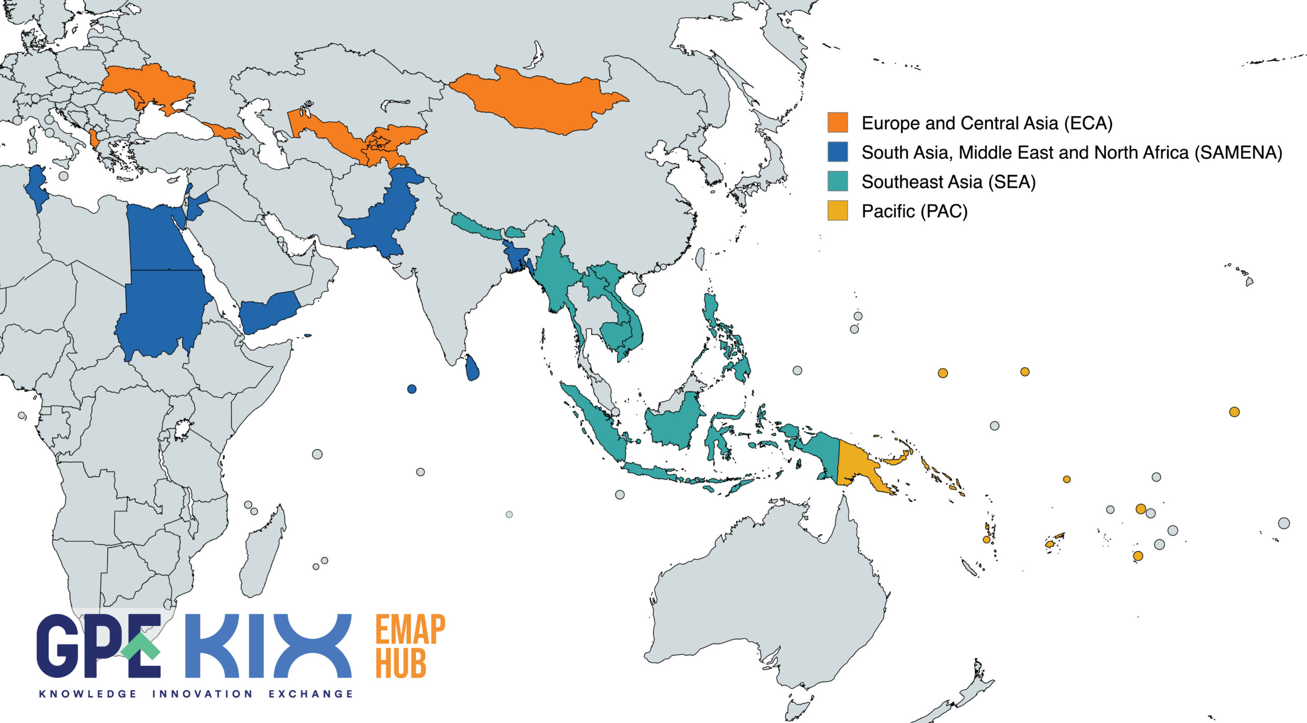 KIX Europe, Middle East and North Africa, Asia and Pacific (EMAP) Hub comprises 37 GPE partner countries. The region covers not only a vast territory, different time zones and a multitude of languages, but also a wide range of countries with diverse trajectories in terms of educational development.